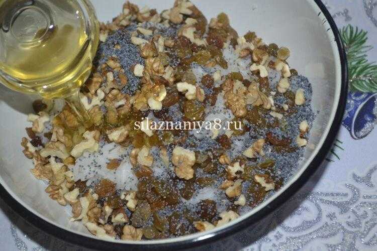 Грецкие рубленные орешки, набухшие сухофрукты и маковую кашицу.