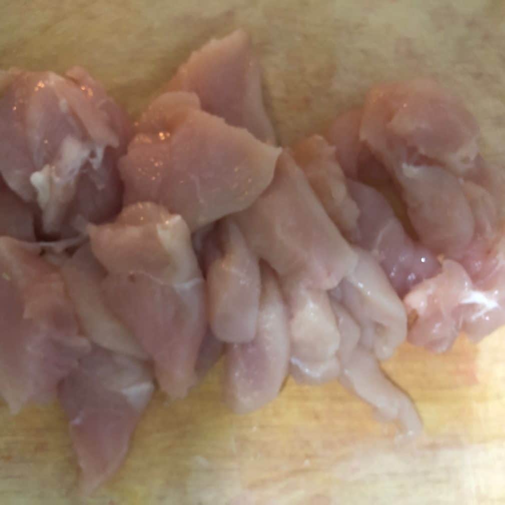 Куриную грудку нарезать небольшими полосками, посолить и поперчить (по 1/2 ч. ложки) – это сделает вкус куриного мяса более насыщенным.