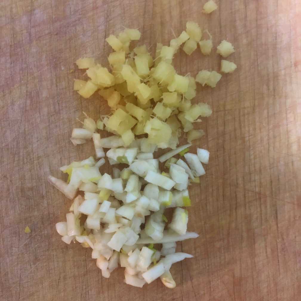 Шаг 2. За этот промежуток времени можно нарезать овощи, в том числе сельдерей на мелкие части, а морковь соломкой. Шинкуем белокочанную капусту, продавливаем через пресс чеснок и мелко нарезаем имбирь в крошку. В последний момент режем зеленый лук до среднего размера части.