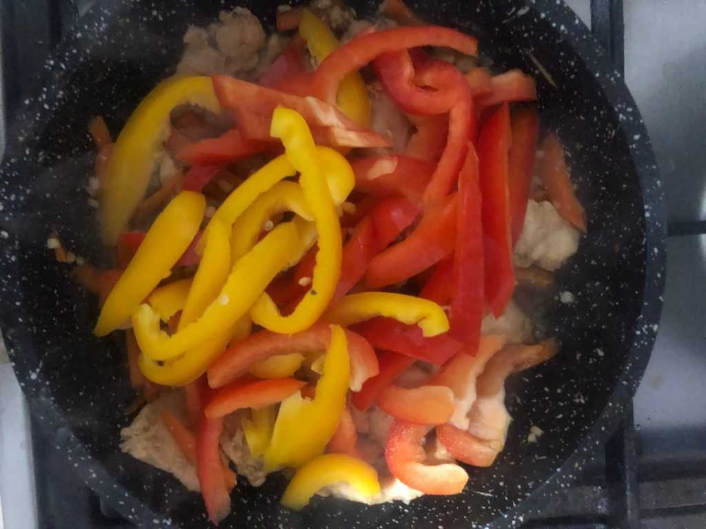 Отдельно обжариваем болгарский перец с редькой, тертой на крупной терке, не более 3-х минут.