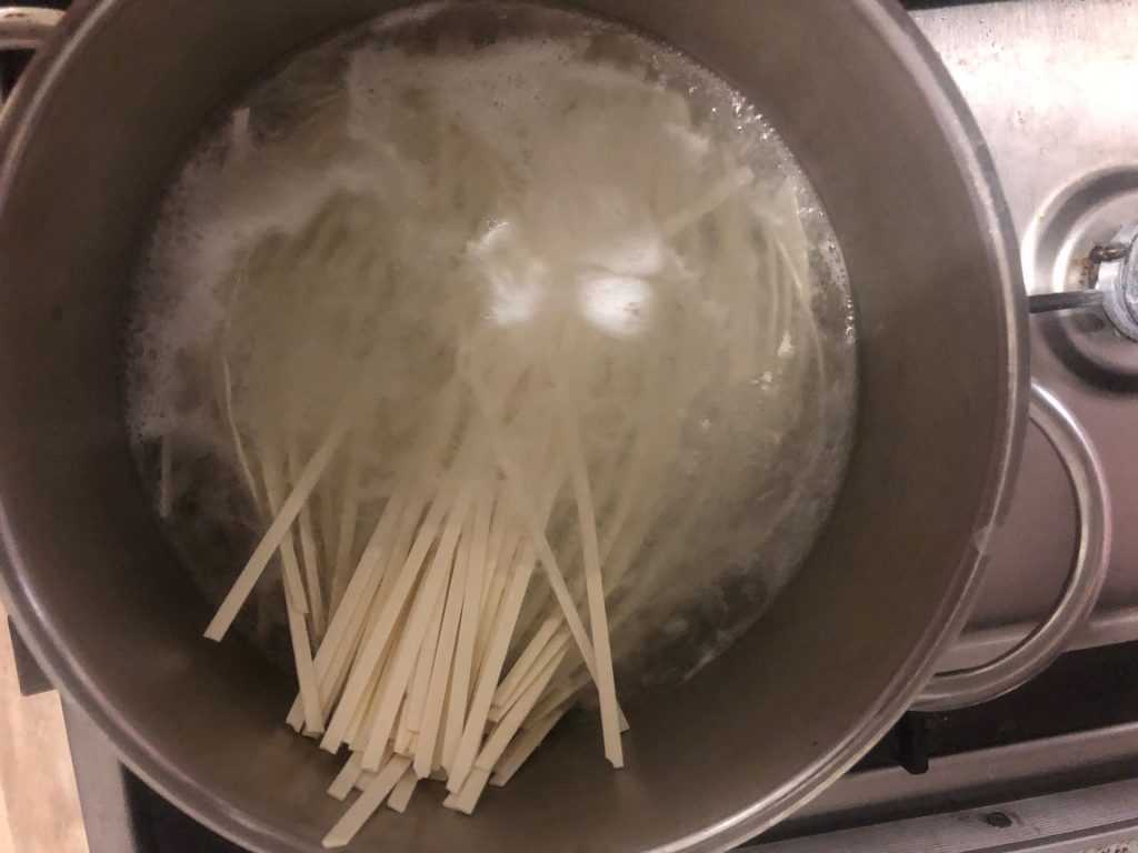 Шаг 3. В воду, которую нужно заранее нагреть до кипятка, кидаем лапшу и варим столько, сколько указано на упаковке, примерно 20 минут. В отдельной миске смешиваем 2 ст. л. сахарного песка, устричного, Чили и соевого соусов, 2 ч. л. рисового уксуса, кунжутного масла и смешиваем.