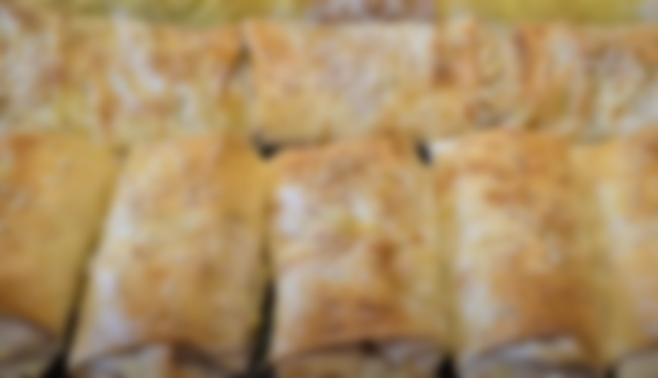 На каждый прямоугольник выложить немного начинки, подвернуть края, скрутить в трубочку.