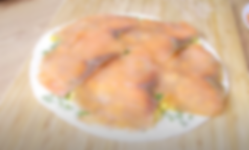 Сверху кладем тонкие кусочки любой красной рыбы, можно взять копченую семгу.