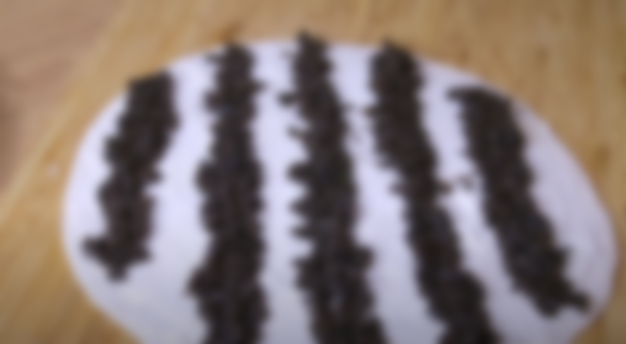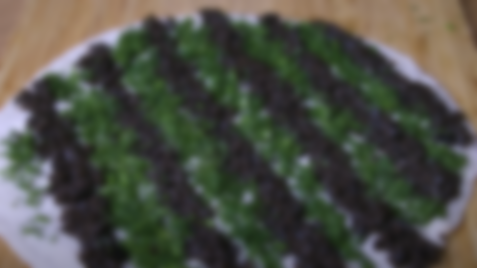 Сверху полосками толщиной в 1,5 см выкладываем измельченные маслины.