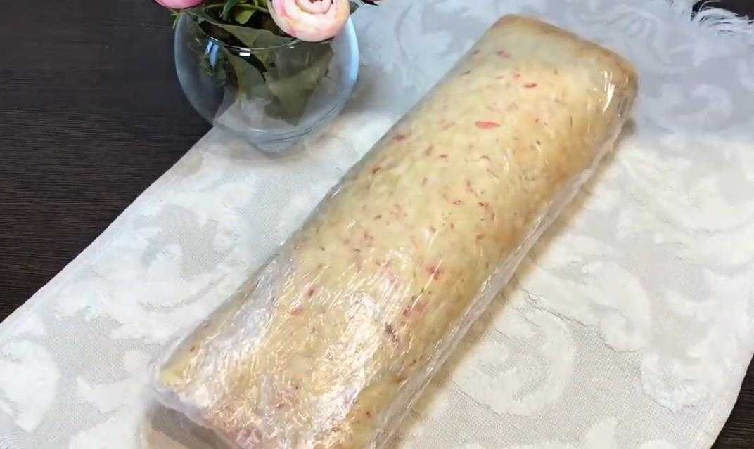 - Завернуть в пищевую плёнку, положить в холодильник на 1−2 часа. Перед подачей к столу нарезать порционными кусочками.