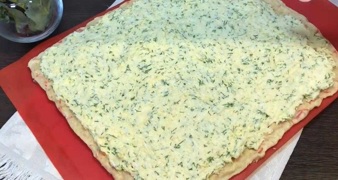 Один лист промазываем плавленым сыром, присыпаем мелко порубленной зеленью укропа и петрушки.