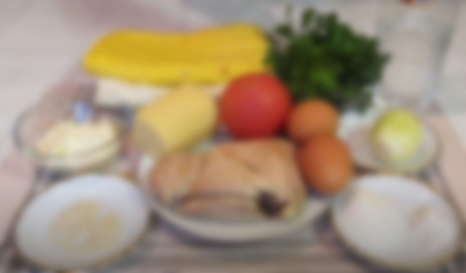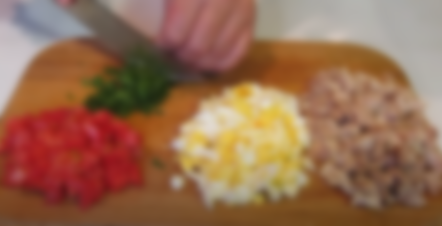 - Подготовим все ингредиенты: сыр трем на терке, малыми кубиками режем колбасу и томаты, измельчаем зеленый укроп.