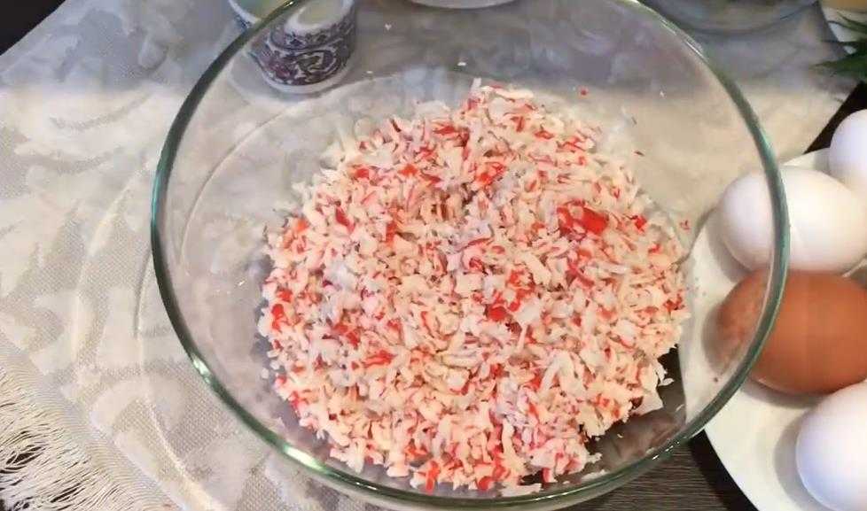 - Вначале режем или трем на терке охлажденные крабовые палочки.