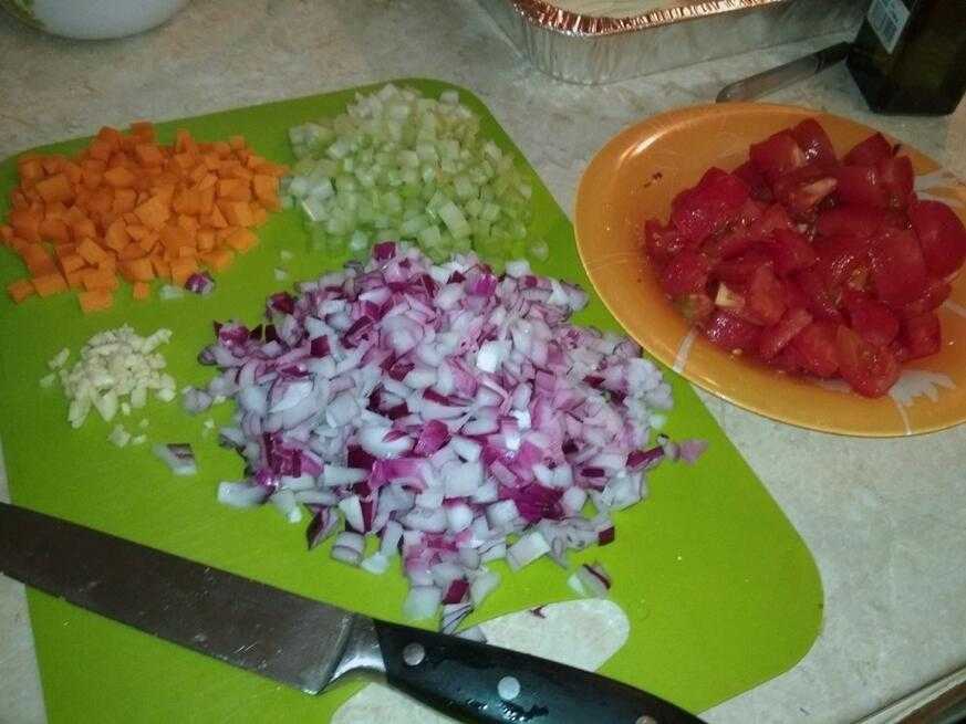 Для начала и для удобства подготовим все овощи. Почистим и измельчим лук и чеснок. Морковку (так же не забудьте почистить!) и сельдерей нарежем мелкими кубиками. Помидоры зальём кипящей водой, дадим немного остыть и очистим от кожи, после чего так же нарежем на мелкие кусочки.