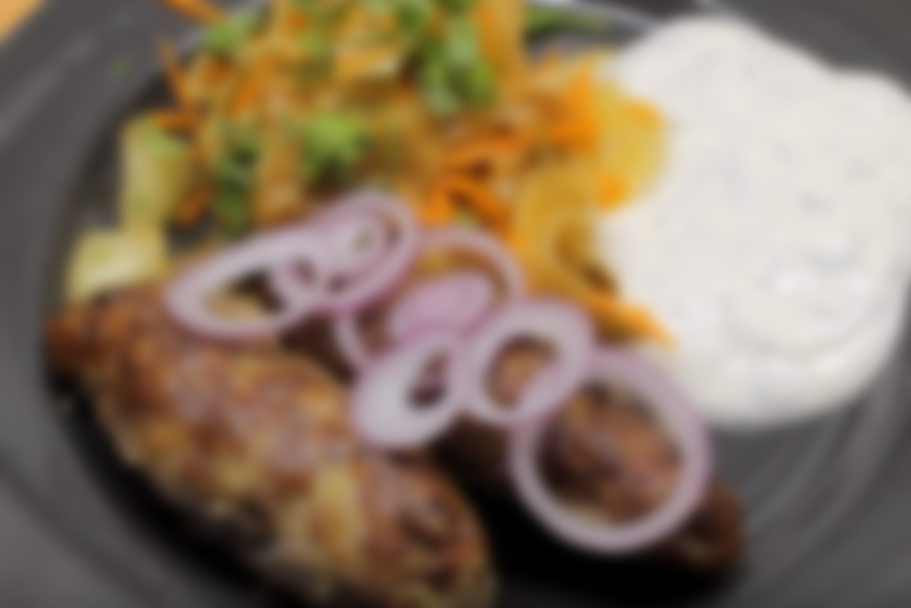 - На широкое блюдо выкладываем салат, соус и люля-кебаб, сверху раскладываем колечки свежего или замаринованного лука.