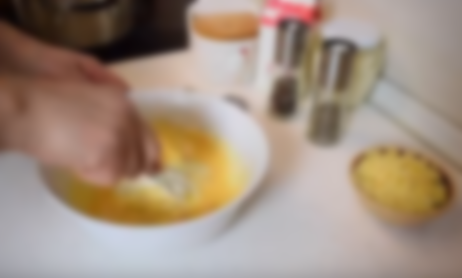 Миксером, блендером или вилкой взбиваем в глубокой миске яйца, молоко и немного соли в однородную массу (без пены).