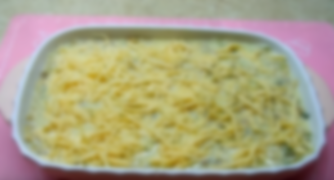 Натираем оставшийся сыр на крупной терке, присыпаем поверхность блюда и отправляем его в духовку, разогретую до 180 градусов, на полчаса.
