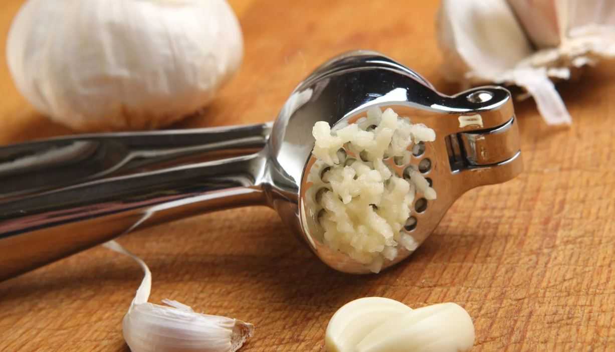 1-2 зубчика очищается и мелко режется либо пропускается через пресс, после чего обжаривается в разогретом масле вместе с луком до золотистого цвета.