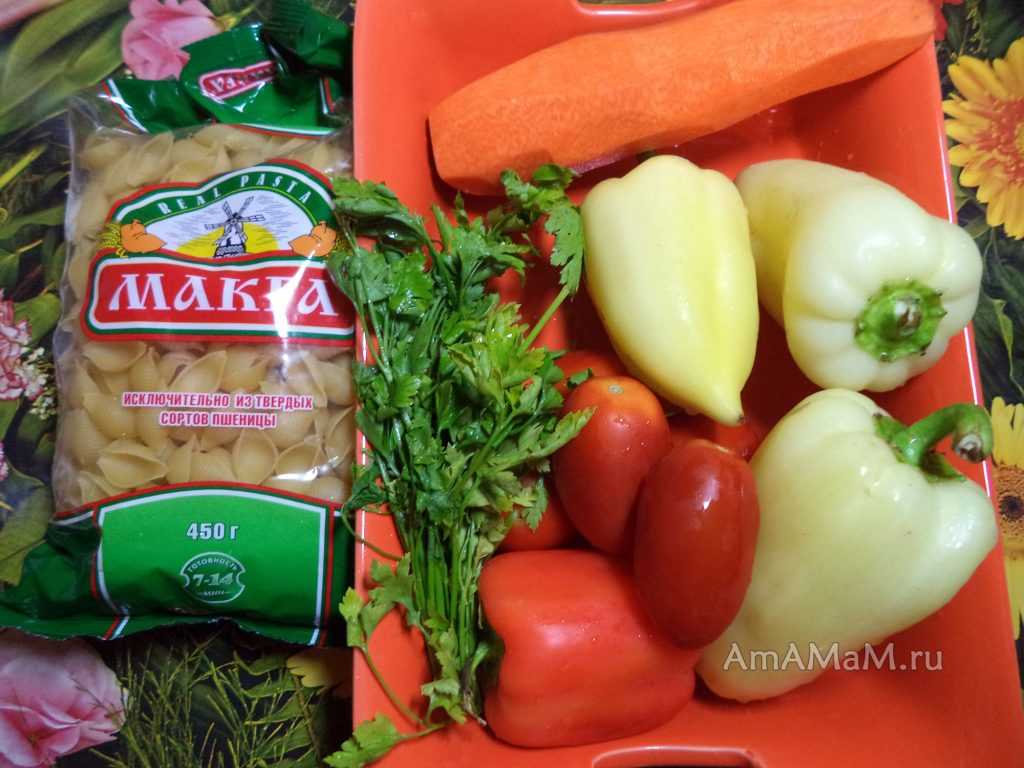 Мелкие макароны и овощи (перец, морковь, помидоры) и петрушка для гювеча с курицей