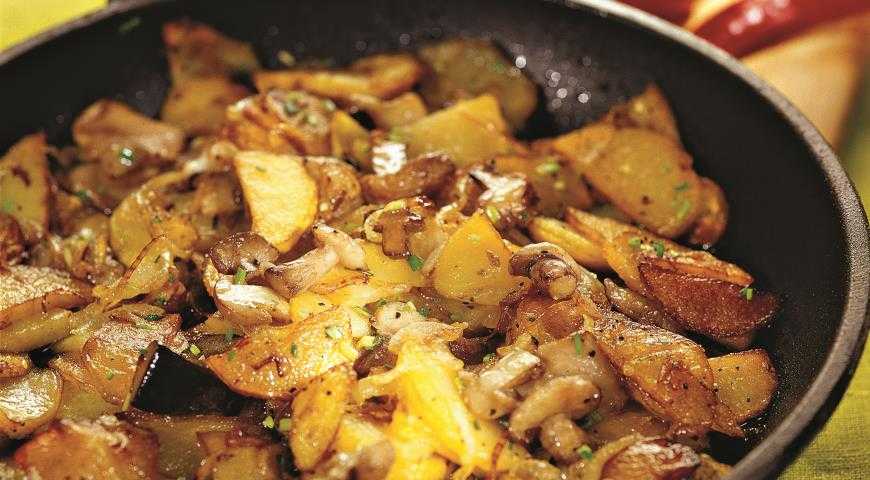 Первый вид, жареная картошка с грибами, готовится в несколько этапов. На первом идет поджарка грибов с луком; на втором — отдельно картошки; на третьем — все объединяется в одно блюдо и подается горячим. Овощи можно жарить вместе, а потом добавлять к ним полуготовые (то есть уже отваренные) или сырые грибы. Солить рекомендуется ближе к окончанию готовки. Картошка не должна быть мокрой, поэтому лучше подсушивать ее бумажными полотенцами.