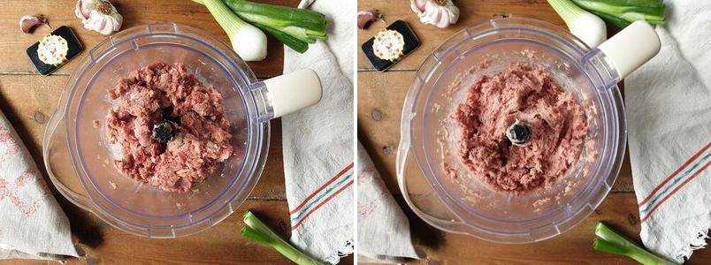 Можно делать это руками, но мы пользуемся миксером с насадками для взбивания теста (фарш из морозилки холодный).