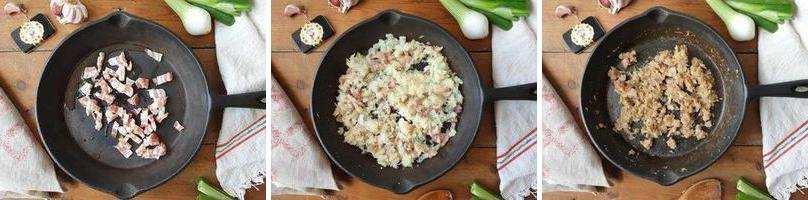 Берем казан вливаем в него жир оставшейся от жарки колбасок. Кладем лук и жарим до полупрозрачности.