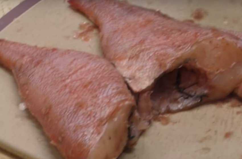 - Тушки морской рыбки чистим и убираем все внутренности. Мы будем готовить филе, поэтому перед тем, как начинать готовить, нужно вытащить продольную большую косточку.
