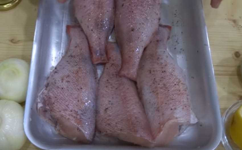 2. Помытую рыбу замаринуйте в соке половины лимона, с добавлением соли и перца. Оставьте на полчаса.