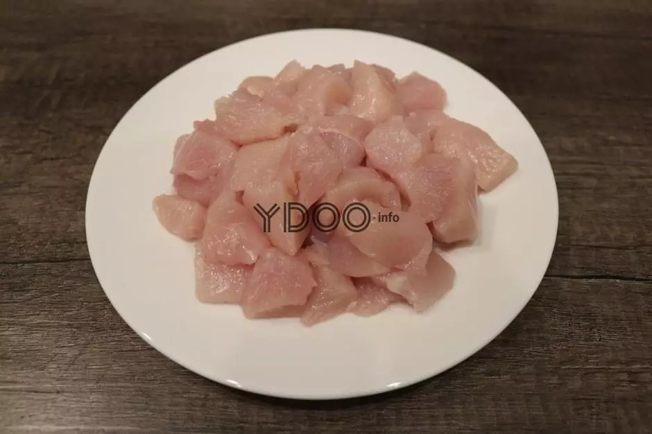 С куриных бедер снимите шкурки. Удалите прожилки и жировые отложения, хрящики и кость. Мясо хорошо промойте под водой, чтобы смыть все сколы косточек. Затем нарежьте курицу на кусочки средних размеров.