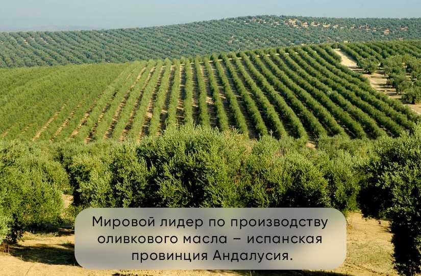 Мировой лидер по производству оливкового масла – испанская провинция Андалусия. Именно в Испании находится штаб-квартира уникальной межправительственной организации – Международного совета по оливковому маслу (International Olive Council или IOC). Целью ее создания является популяризация продукта во всем мире. В тройку самых «оливковых» стран входят также Италия и Греция.