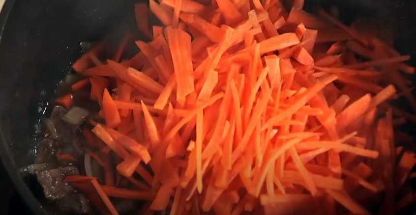 Когда лук размягчится, отпускаем в казан морковь.