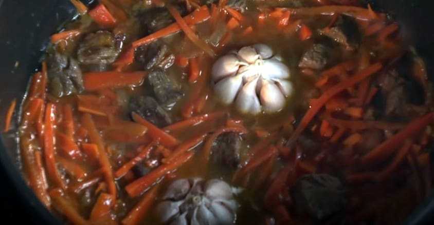 - Раскладывают по поверхности мяса с овощами чесночные дольки или целые его головки, затем – слой риса. Солят и вливают воду. Она должна прикрыть рис на 1 см.