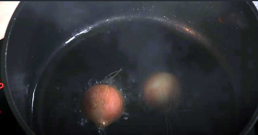 Теперь слегка очищаем луковицу от шелухи (полностью не нужно), разрезаем пополам и бросаем их в курдючный жир. Лук должен перекалиться. Когда луковица поменяет цвет, станет темно-коричневой, с помощью шумовки удаляем из казана.