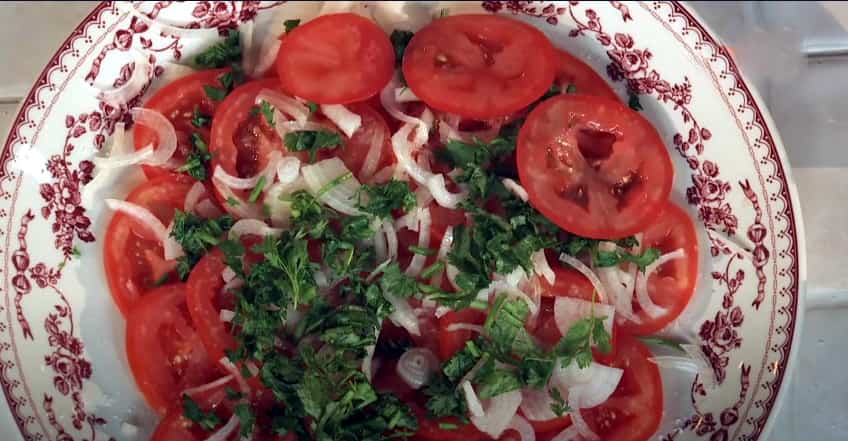 Теперь снова слой помидор, измельченного лука и кинзы.