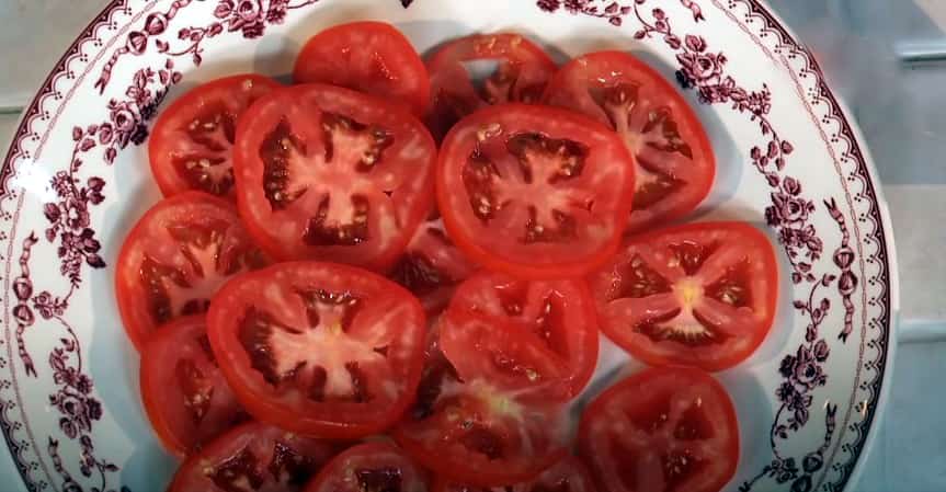 Для салата потребуется большая плоская тарелка. Помидоры (на мой вкус самые сочные и нежные — розовые сорта) вымоем. Берем острый нож и нарезаем томаты кружочками достаточно тонко. Выкладываем нарезку на всю ширину блюда.