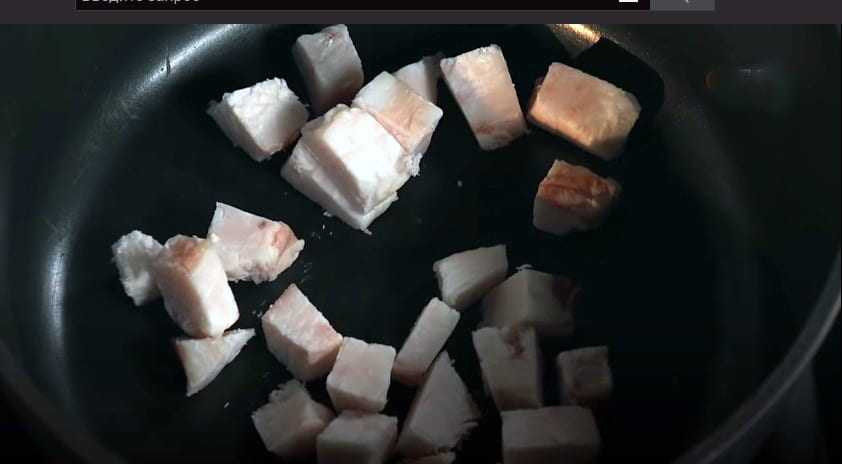 - В сотейнике обжаривают порезанную кубиками жирную баранину, после чего ее выкладывают.
