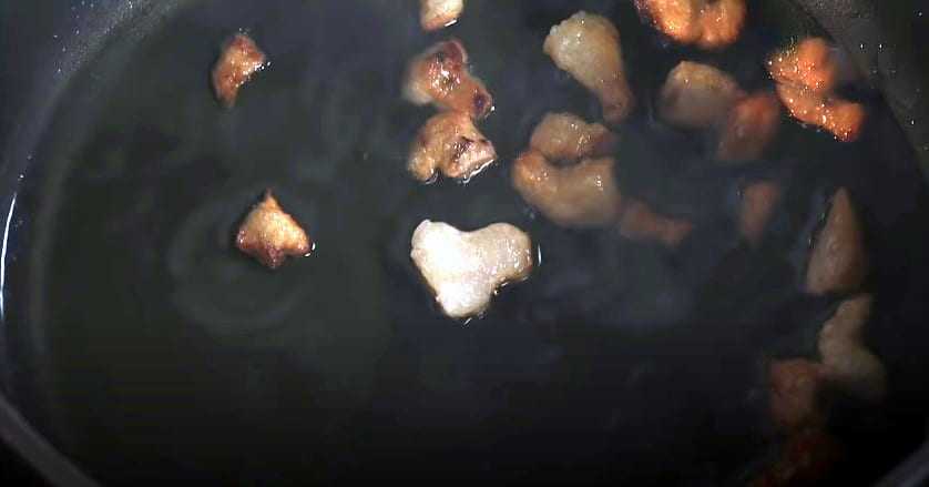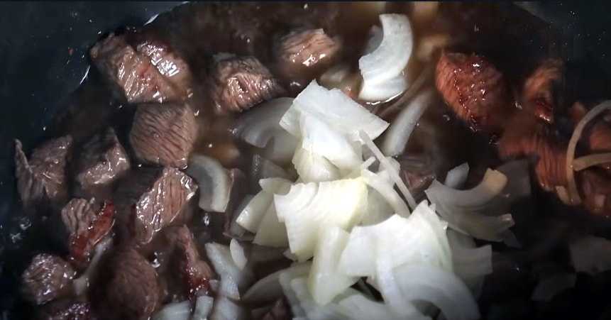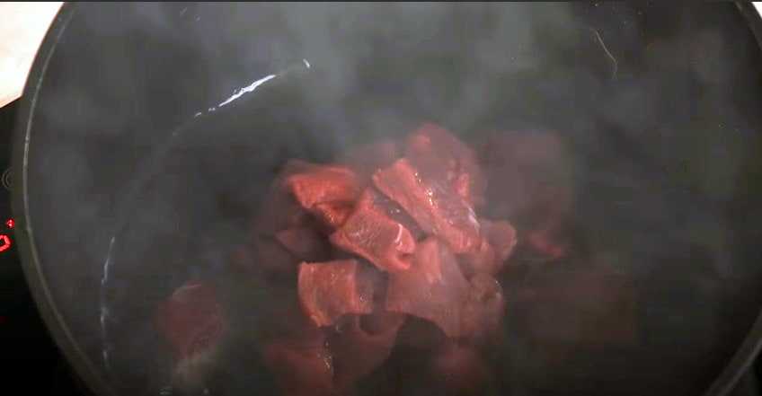 В разогретый жир отправляем нарезанную кубиками говядину