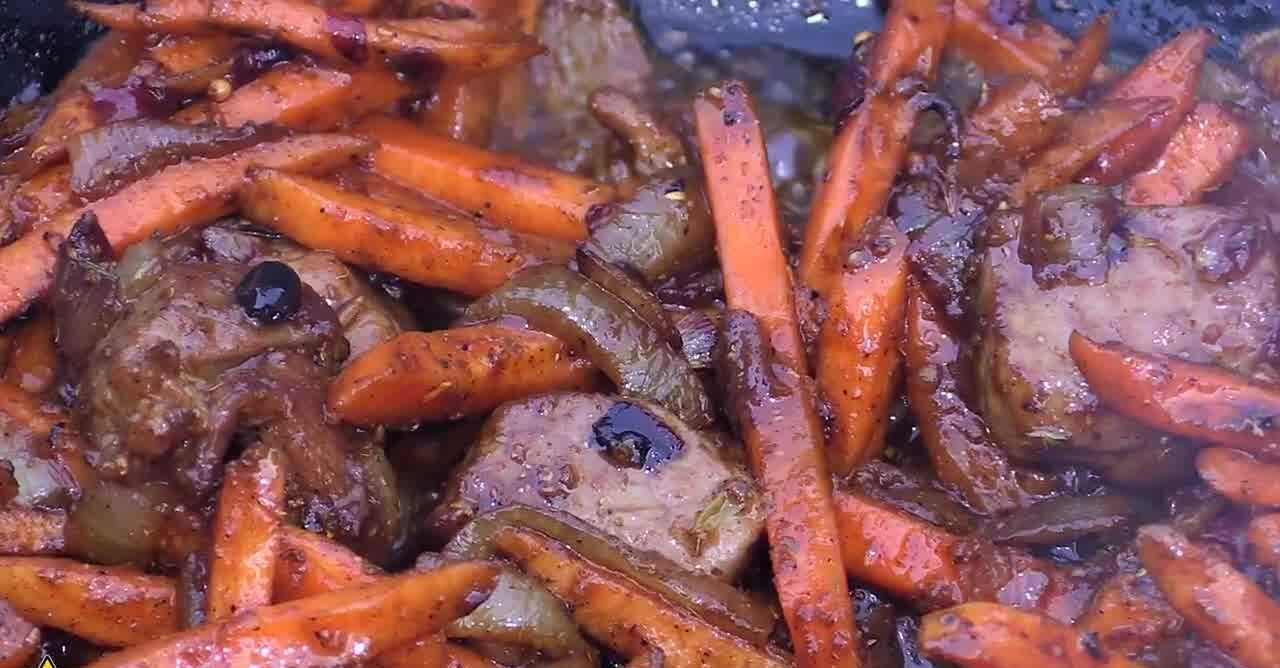 Потушите морковь с мясом в растительном масле 10-15 минут.