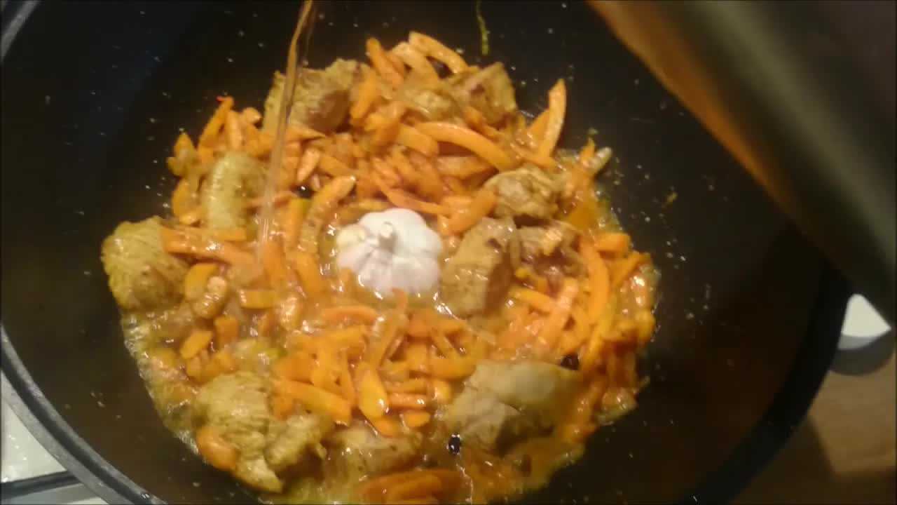 Всё время приготовления зирвака (мяса с овощами) огонь держим сильным, помешиваем регулярно. К обжаренному мясу, когда полностью перестанет выделяться влага на дне казана, добавляем морковку, прожариваем минут семь. Кладём очищенный от шелухи чеснок целыми головками и обе неразрезанные перчинки. Посыпаем специями, присаливаем, с запасом на рис.
