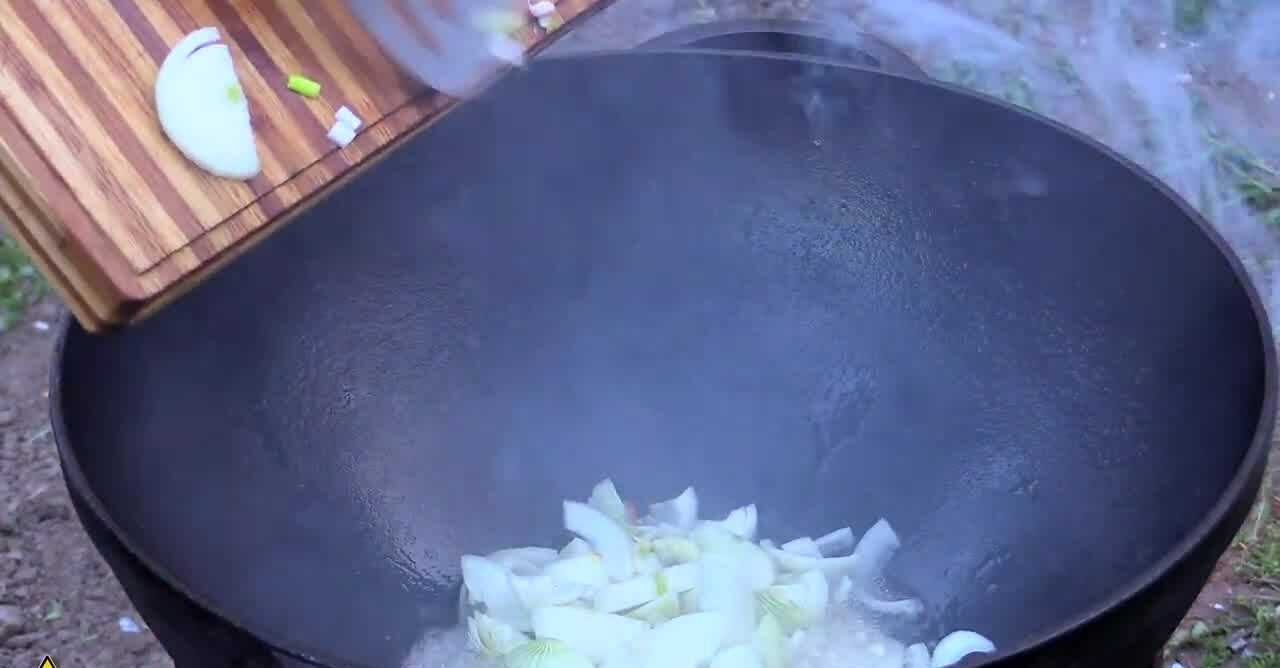 1. Для начала заливаем рис холодной водой и оставляем на 1 час. Лук очищаем и нарезаем полукольцами, морковь крошим длинными брусочками. Разводим костер. Берем большой казан, размещаем его над костром. Вливаем растительное масло так, чтобы края казана были смазаны. На разогретом масле обжариваем лук до коричневого цвета.