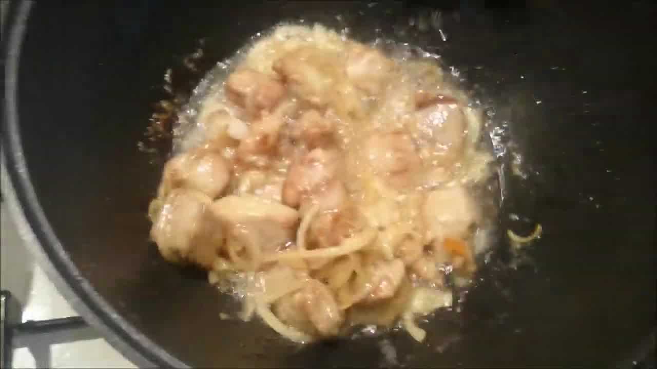 Казан ставим на сильный жар. В отличие от шашлыка, плову пламя не помеха, но будьте осторожны и не обожгитесь. Раскаляем в котелке около стакана масла до лёгкого дымка. В масло опускаем лук и, помешивая длинной лопаткой, слегка подрумяниваем. Быстро выкладываем мясо и перемешиваем.