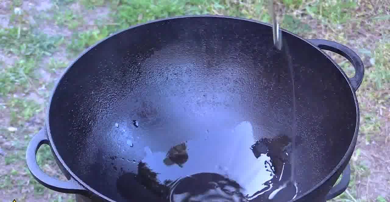 На огонь костра следует установить котел, объемом в 12 литров. В него влить растительное масло, размазывая его по стенкам.
