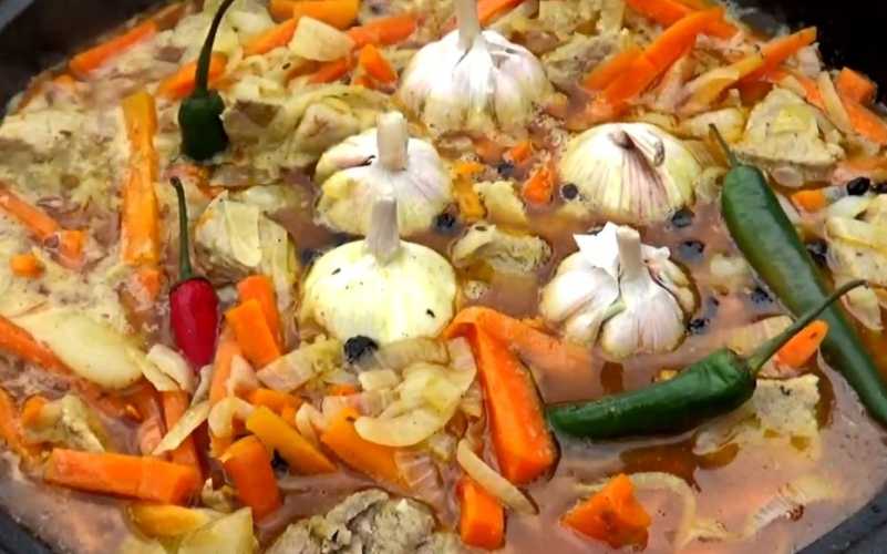 Уменьшить количество дров под казаном, чтобы получить слабый огонь. Протушить примерно полчаса под крышкой, а потом вытащить чеснок и перец (но не выбрасываем, они нам понадобятся ещё). Массу посолить, добавить зиру, растерев ее между ладонями.