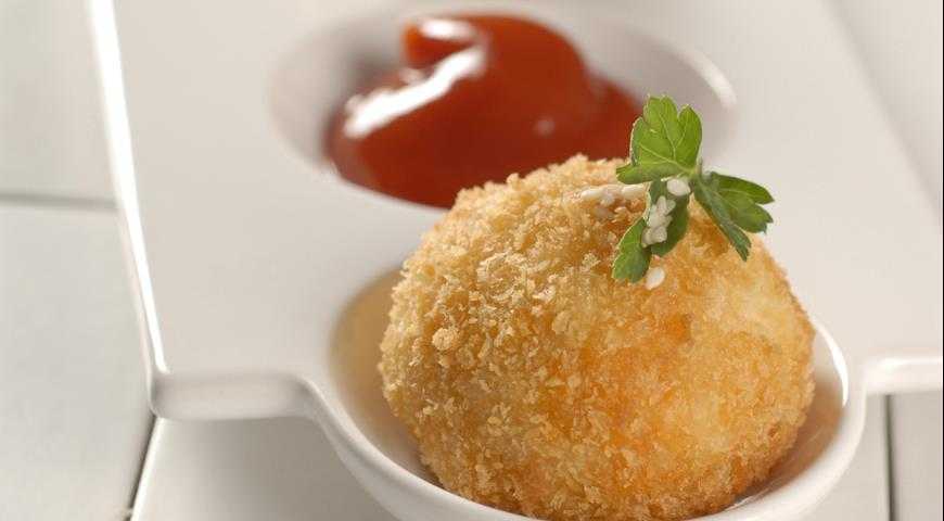 - Обмакнуть шарик в яичной смеси, затем обвалять в панировке