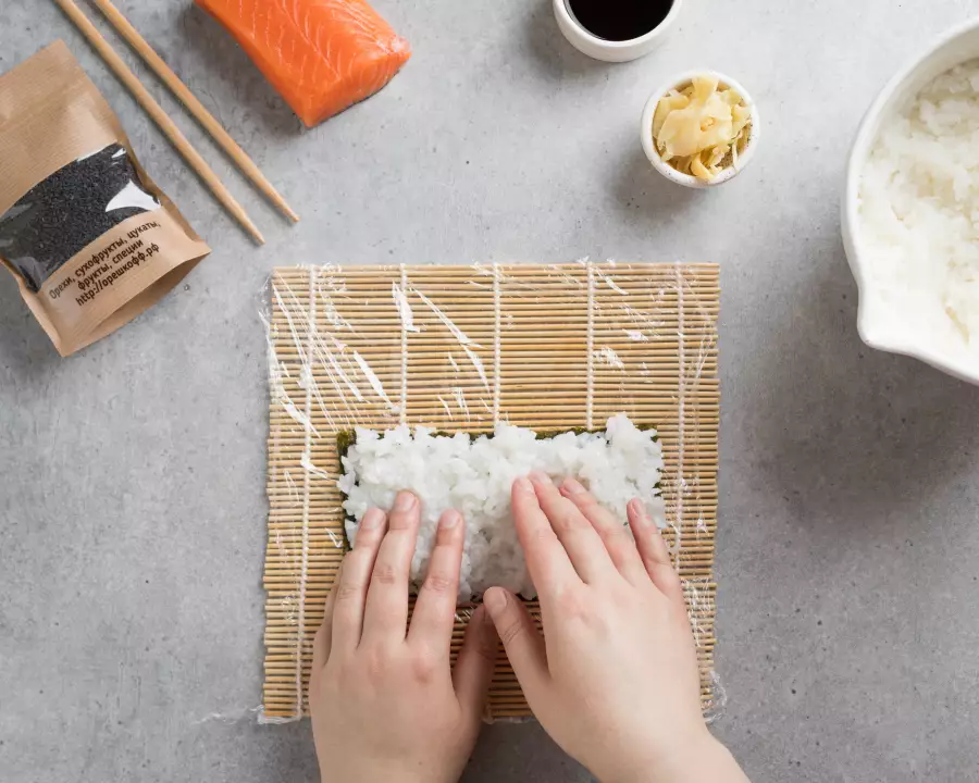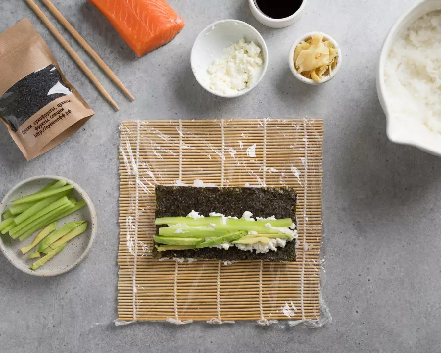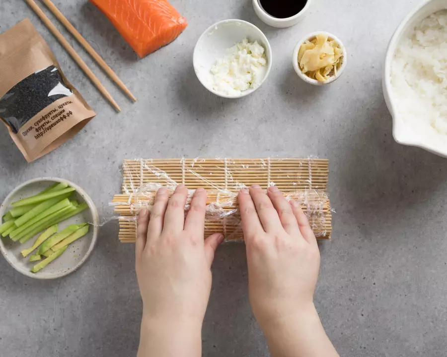 Кроме того, в процессе не обойтись без пищевой пленки и циновки. Последнюю можно отыскать в обычных хозяйственных магазинах или же в тематических лавках, где продается все для азиатской кухни.