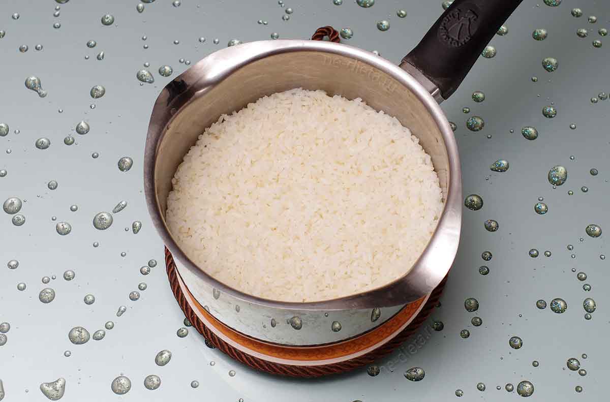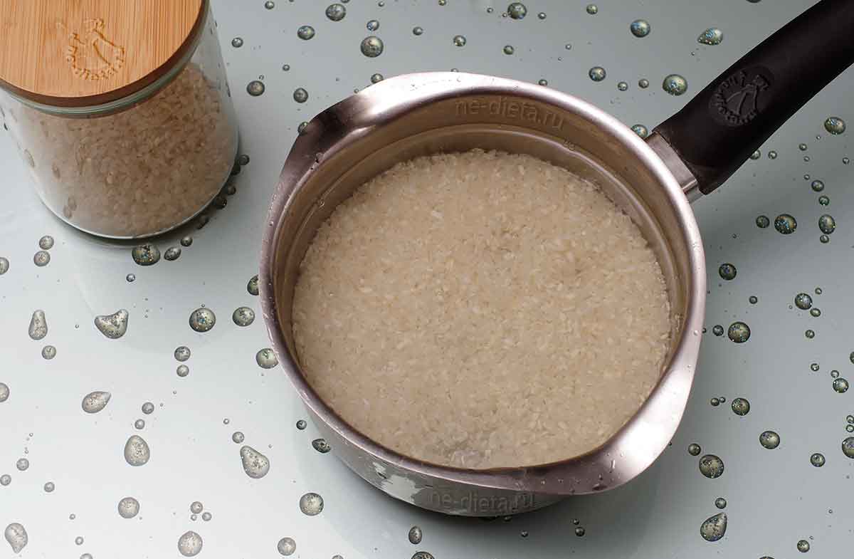 - Рис тщательно промыть, залить водой из расчета 2:1. Дождаться закипания воды, затем убрать огонь под кастрюлей до минимума. Варить рис в течение 10-14 минут. Снять с конфорки и оставить под закрытой крышкой еще минут на 20;