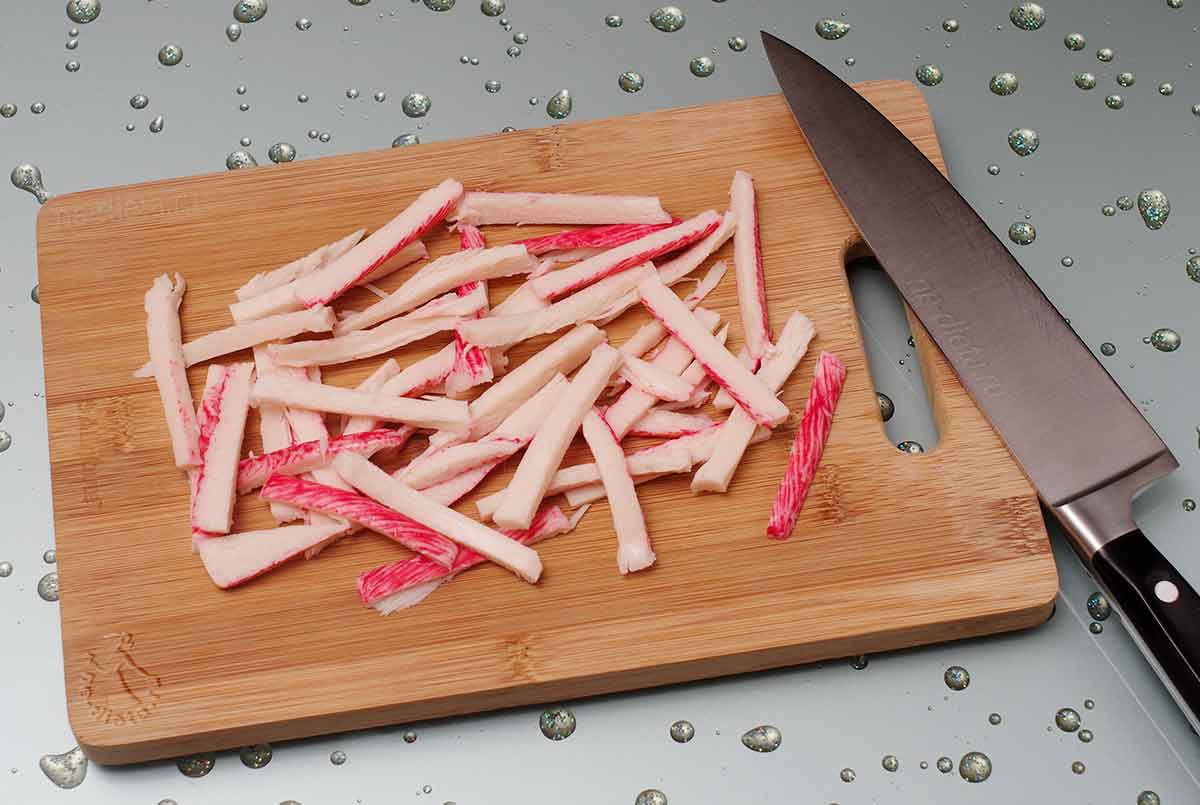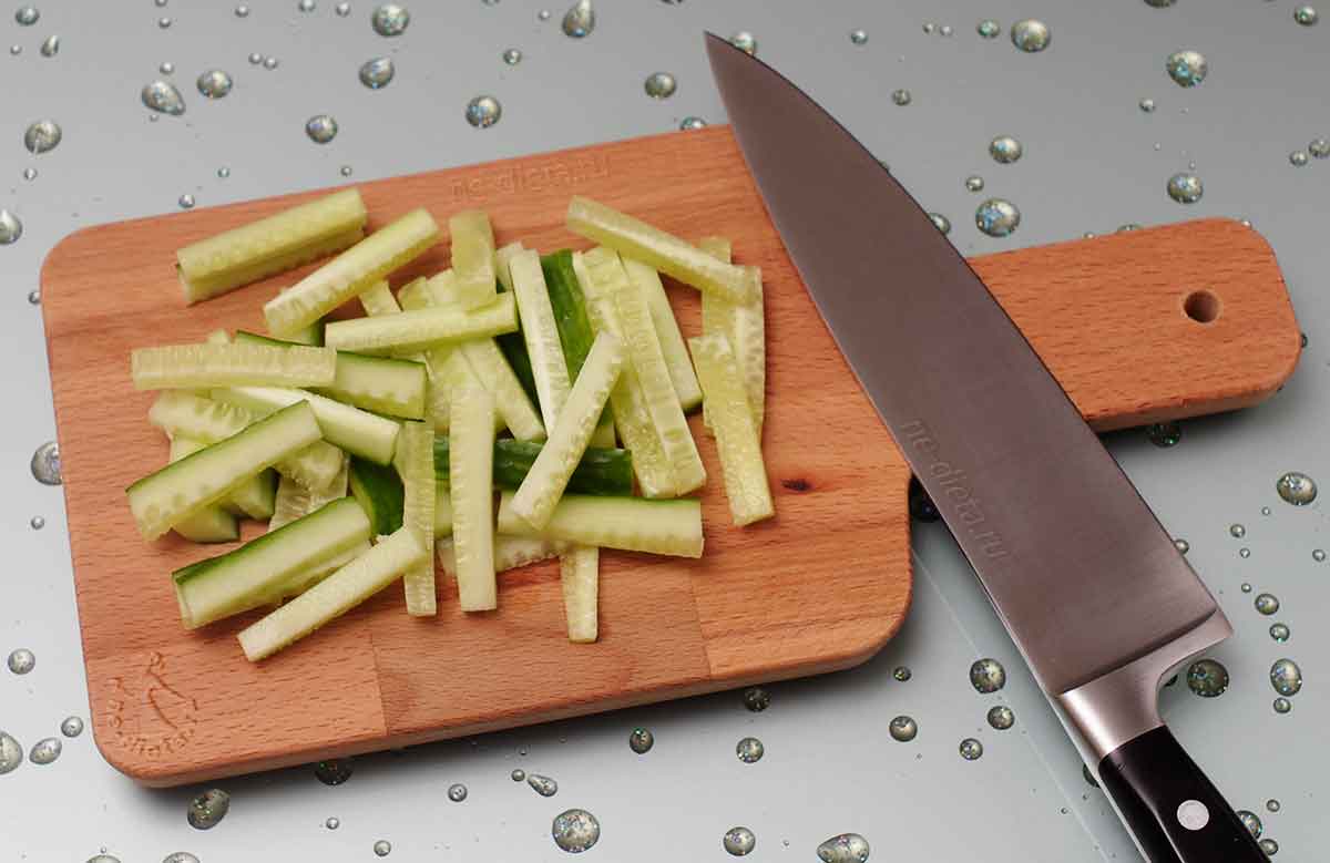 - Начинку — огурцы и крабовые палочки — настрогать соломкой по вкусу (оптимальная толщина для ролла не больше 0,6 см). Если крабовые палочки подвергались заморозке, их следует предварительно согреть до комнатной температуры и отжать от лишней влаги;