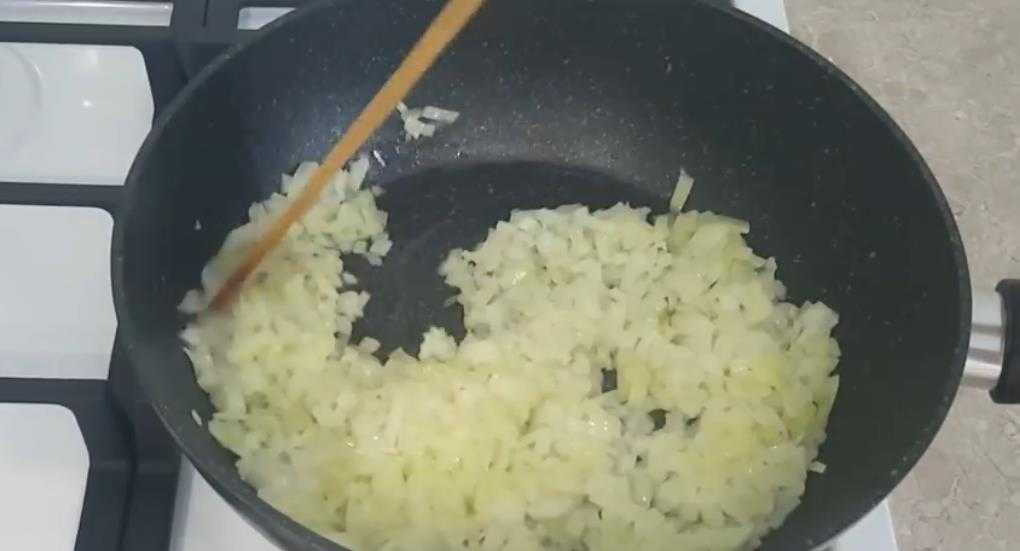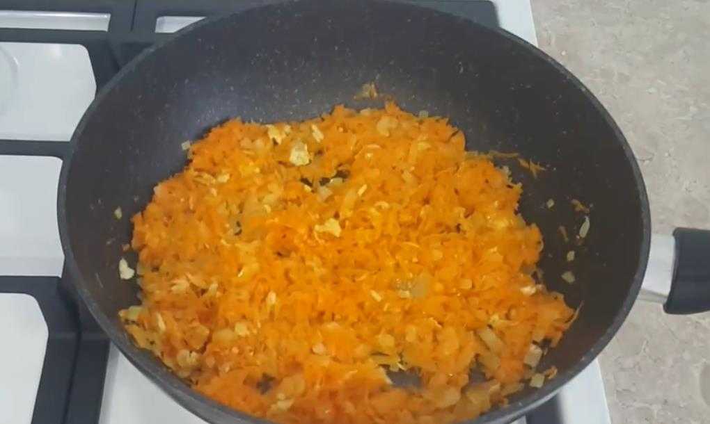 - Обжарить луковые ломтики на растительном масле до прозрачности. Нарезать морковку мелкими кубиками, обжарить вместе с луком до мягкости.