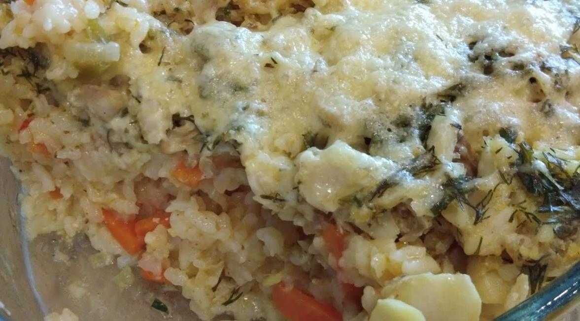 Сочная рыба с рисом и овощами, запеченная в духовке