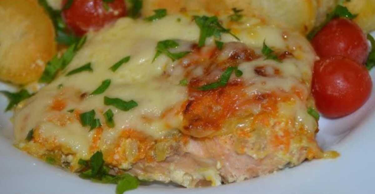 Вынимаем противень и наслаждаемся нежным и ароматным вкусом запечённой рыбки. Её можно украсить веточкой зелени, цельными оливками без косточек или помидорами черри.
