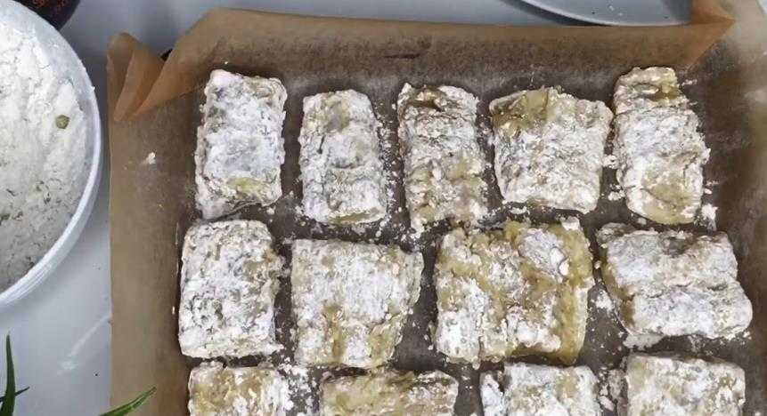 Треску окунуть в масло, обвалять в муке со всех сторон. Разложить ломтики на противень, устланный пергаментной бумагой.