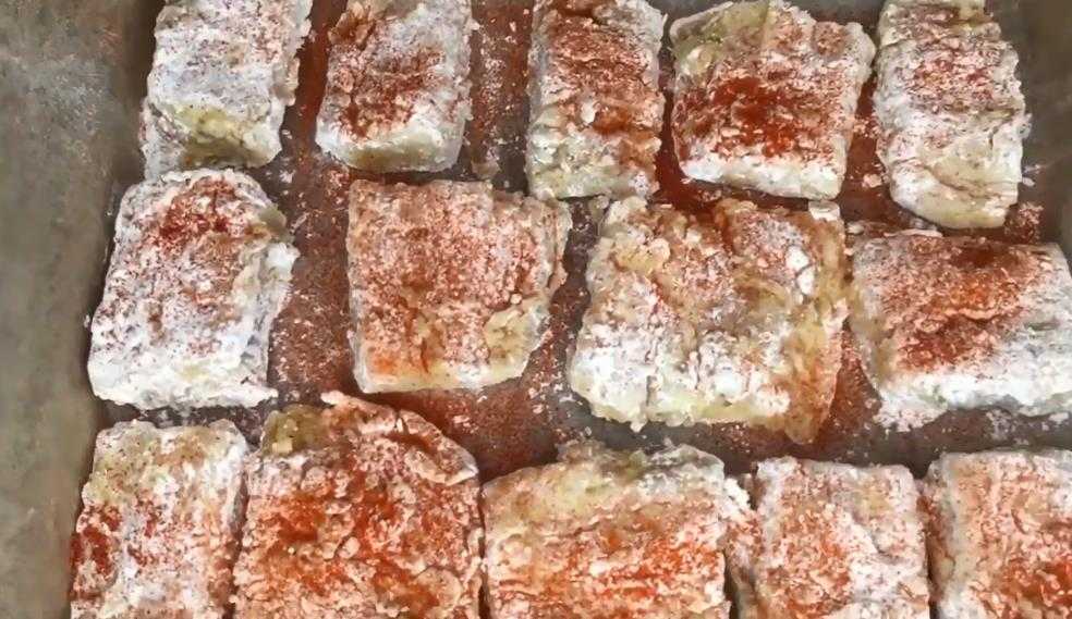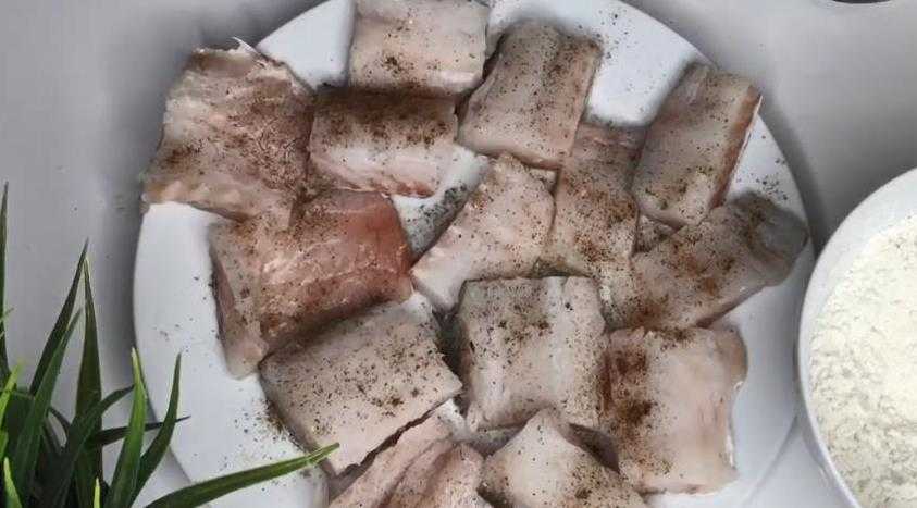 Чищенную и промытую рыбу нарезать на одинаковые кусочки. Удалить у минтая внутренности и плавники, поперчить, посолить. Помассировать рыбные кусочки и замариновать примерно 20-25 минут.