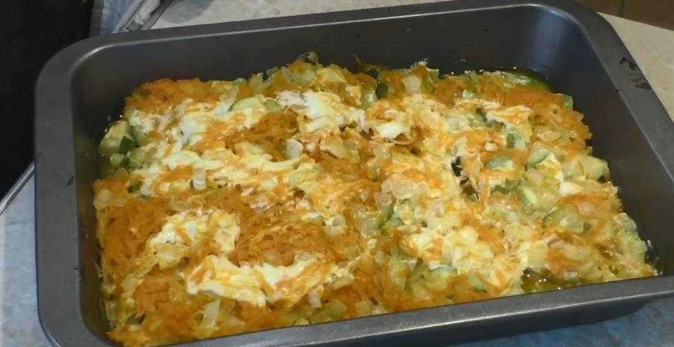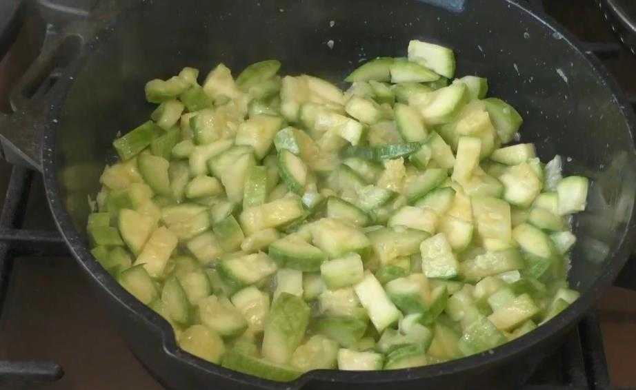 Морковь натереть на крупной терке. Лук и кабачок нашинковать мелкими кубиками. На раскаленном растительном масле обжарить кабачки под крышкой 7 минут, посолив их.