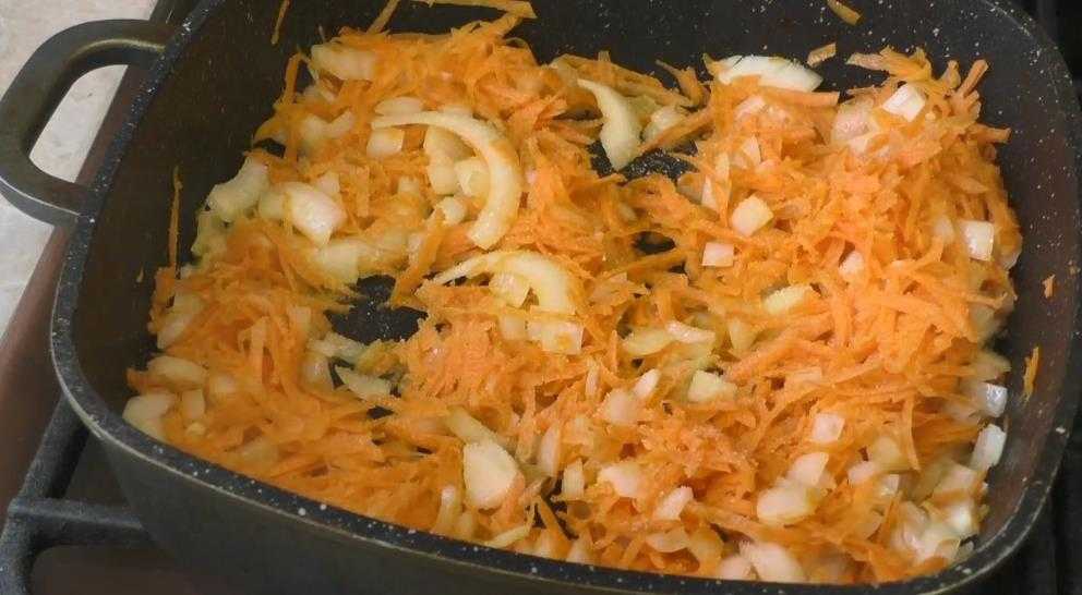 На другой сковороде в масле жарить до румяности лук с морковкой, периодически его перемешивая.