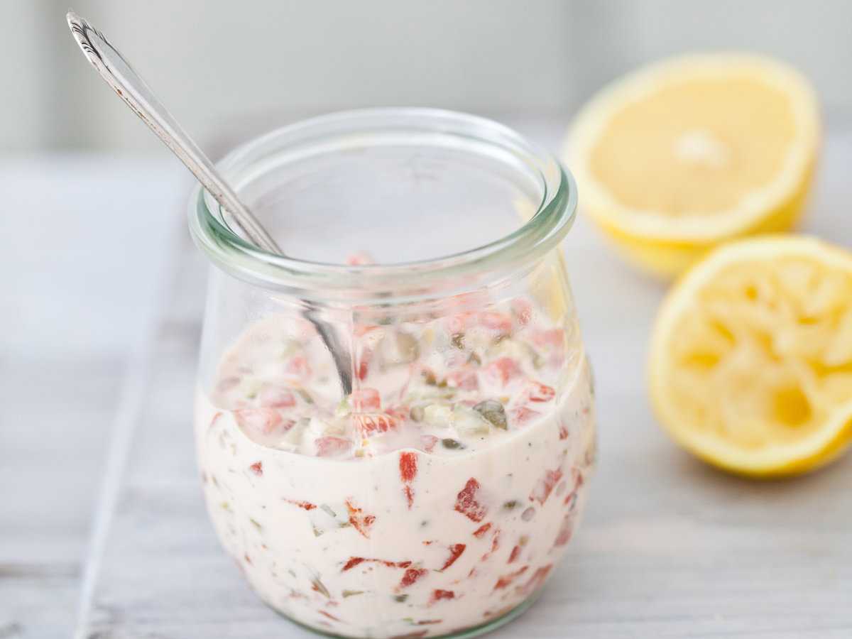 Каперсы и маринованные огурцы придают терпкую остроту, уравновешивая сливочность майонеза. Вустерширский соус и дижонская горчица придают пикантную глубину и лёгкую остроту, а укроп вносит свежую травянистую ноту.Наконец, лимонный сок придаёт яркую кислотность.